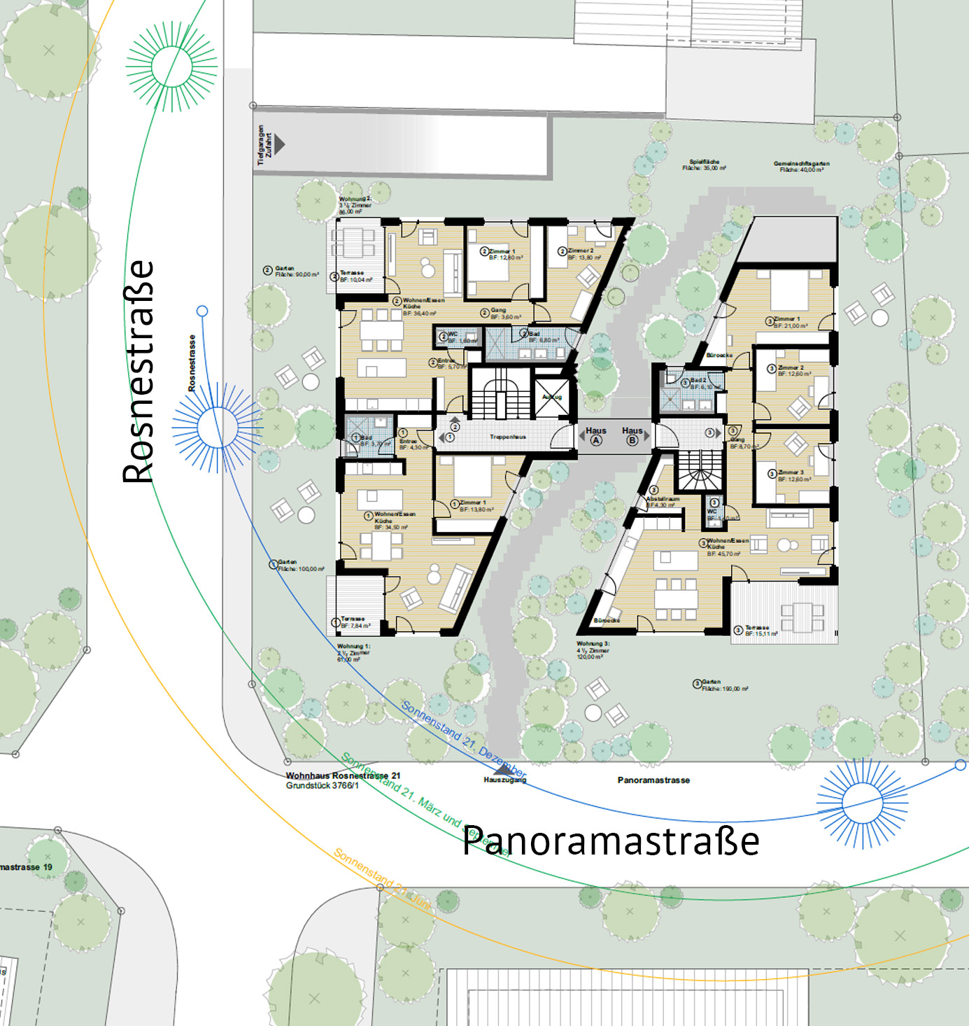 Nahezu alle Wohnungen verfügen über mehrere Zugänge in den Garten oder auf eine Terrasse oder umlaufenden Balkon.